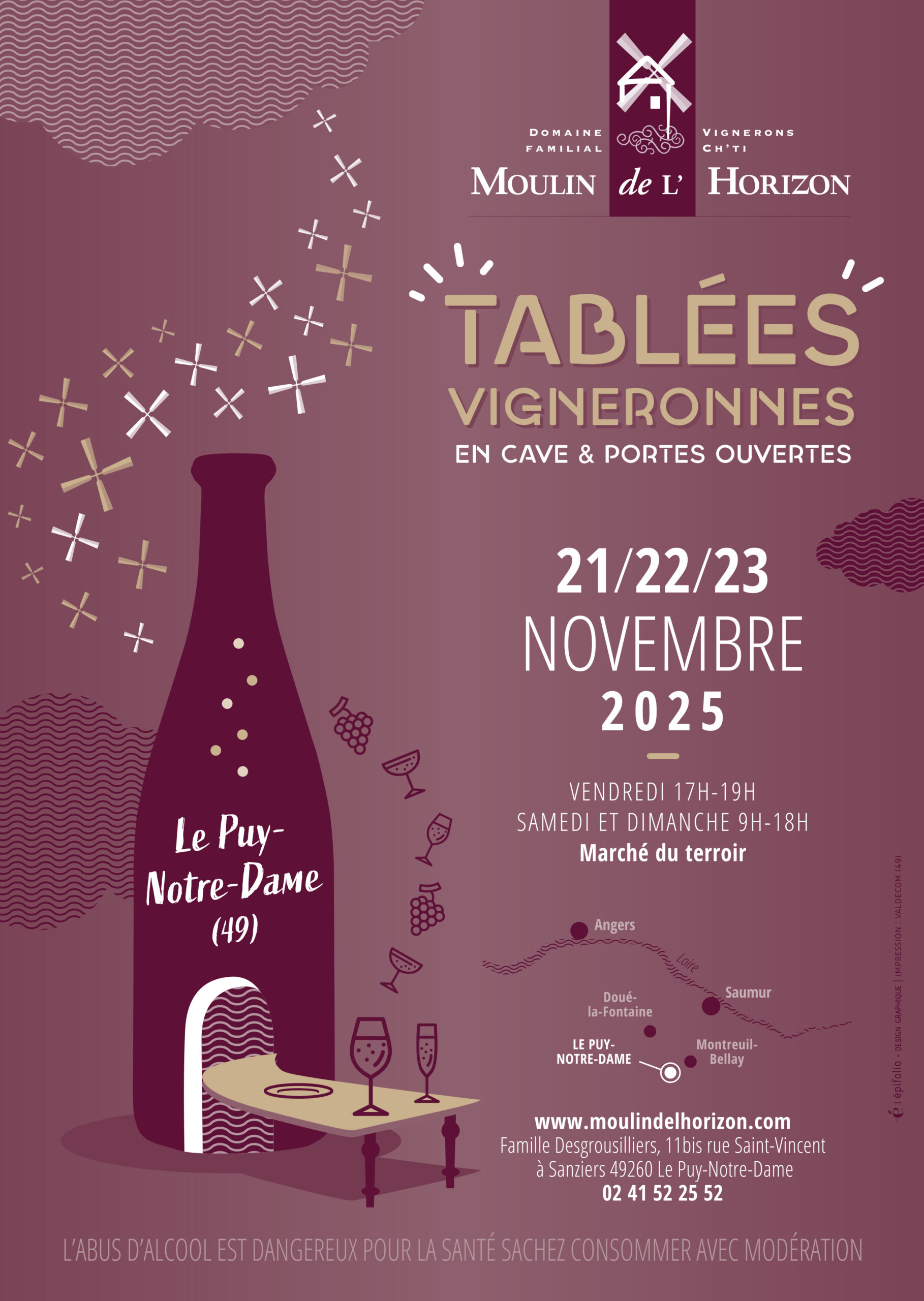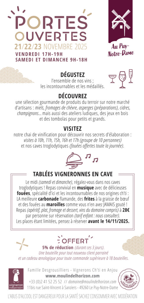 N’oubliez pas les tablées vigneronnes : un repas convivial et musical en cave le samedi et dimanche midi vous est proposé. Au menu : des fouées, spécialités d’ici, et les incontournables de nos origines Ch’tis : LA carbonade flamande, des frites à la graisse de bœuf et des fouées au maroilles !
